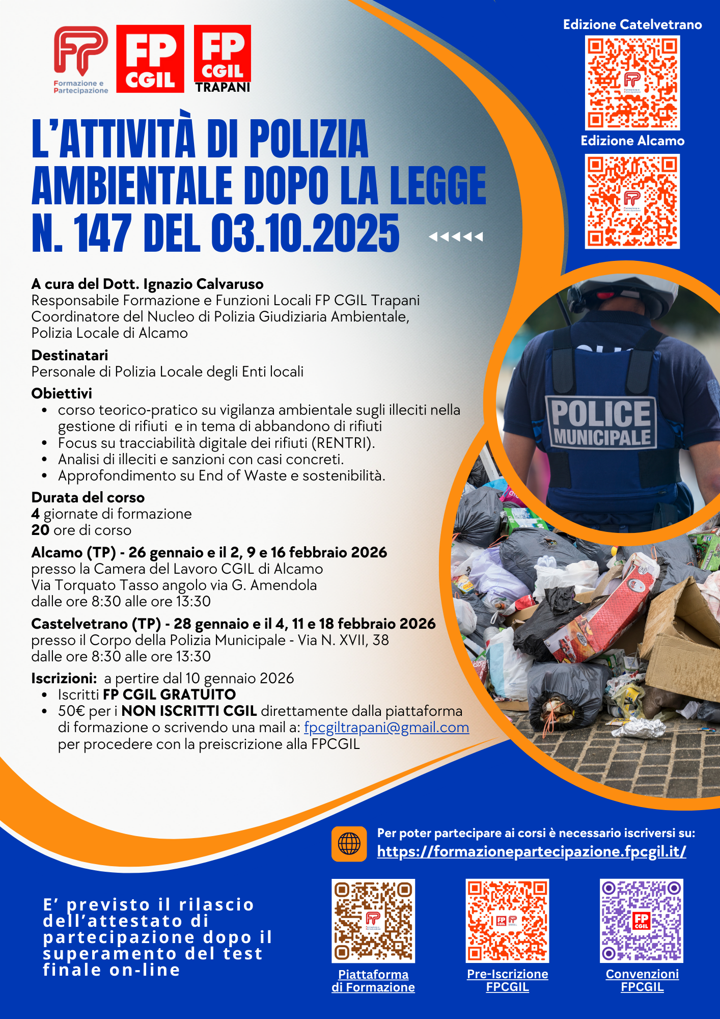 Trattasi di un corso di aggiornamento organico in quattro sessioni di 5 ore ciascuna sull’attività operativa della polizia ambientale nel campo del contrasto degli illeciti penali ed amministrativi nella produzione e gestione dei rifiuti speciali, nonché nel campo del contrasto ai fenomeni diffusi di abbandono/discarica dei rifiuti urbani e speciali sia su area pubblica che su area privata, con descrizione dei rispettivi adempimenti sanzionatori e di quelli complementari per il ripristino dello stato dei luoghi. Verrà analizzato il nuovo Sistema di tracciabilità dei rifiuti a seguito dell’introduzione del R.E.N.T.R.I. a fronte del D.M. n. 59 del 04.04.2023, con la correlata sostituzione dei formulari e registri di carico e scarico cartacei con quelli digitali della omonima Piattaforma Digitale Nazionale ed individuazione delle Aziende e degli Enti obbligati alla Registrazione e relative tempistiche. Saranno presentati, anche tramite la trattazione di casi concreti, i principali illeciti amministrativi e penali e le relative sanzioni previsti nel campo della gestione dei rifiuti dalla parte IV del D. Lgs. N. 152/2006, anche alla luce della recente riforma introdotta dalla L. n. 147 del 03.10.2025. Verrà illustrata alla luce di casi concreti affrontanti il tema della procedura estintiva dei reati ambientali contravvenzionali.
