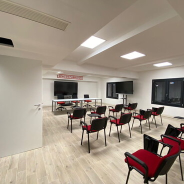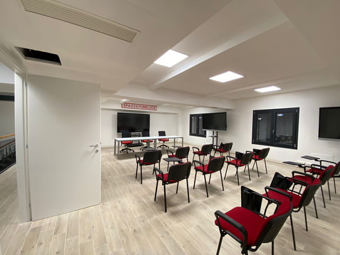 La struttura è disposta su due piani: la grande sala al piano terra può ospitare fino a 120 sedute, mentre al primo piano sono ospitate 3 aule da 25 sedute ognuna, tutte completamente autonome ed insonorizzate, aule che all’occorrenza possono essere modulate trasformandole in un’altra grande sala da 75 sedute.